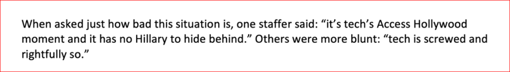A NetChoice deixa o Twitter saber que haverá um “banho de sangue” nas próximas audições[no Congresso], com os membros a dizerem que é um “ponto de viragem”, queixando-se que as tecnológicas “cresceram tanto que nem conseguem regular-se, por isso o Governo pode ter de intervir”.