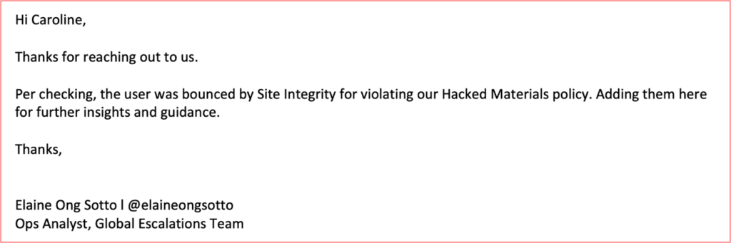 A nota de Strom gerou a resposta de que a história do portátil tinha sido removida por violação da política de “materiais hackeados [pirateados informaticamente]” da empresa: