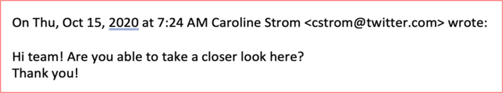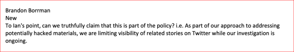 Pode ver a confusão na seguinte longa troca [de e-mails], que acaba por incluir Gadde e o ex-chefe de Confiança e Segurança, Yoel Roth. O funcionário da área de Comunicação, Trenton Kennedy, escreve: “Estou a lutar para compreender a base política para marcar isto como inseguro”: