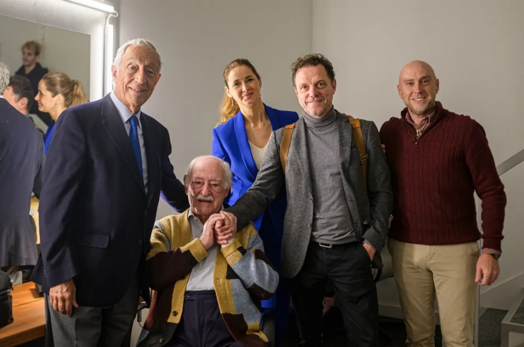 Carla Matadinho, proprietária exclusiva da Yellow Star Company, numa homenagem este mês ao actor Ruy de Carvalho, ao lado do encenador Paulo Sousa Costa (seu marido) e de Marcelo Rebelo de Sousa.