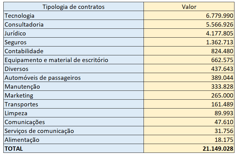 Com preço contratual acima de 500.000 euros, foram publicados 19 contratos, dos quais oito por concurso público, sete ao abrigo de acordo-quadro e quatro por ajuste-directo.
