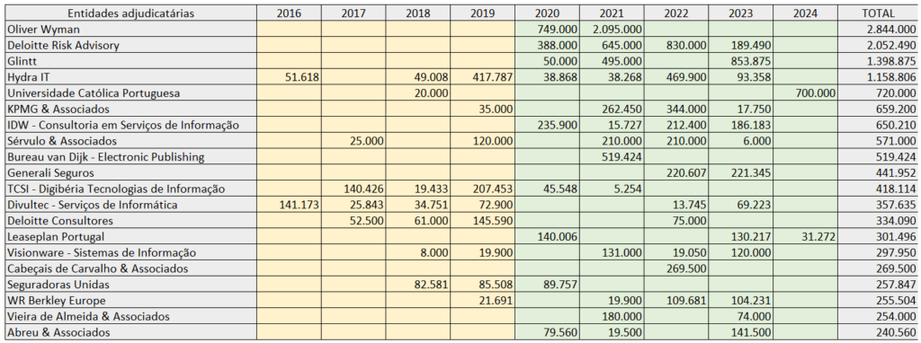 A segunda maior tipologia de gastos foi para contratação de externa de serviços de assessoria financeira. Neste grupo destacam-se os contratos das consultoras Oliver Wyman (com 2,84 milhões de euros), Deloitte Risk Advisory (2,05 milhões de euros), KPMG (659 mil euros), Deloitte Consultores (334 mil euros) e ainda da Universidade Católica Portuguesa (720 mil euros, que inclui um pequeno ajuste directo de 20 mil euros em 2018).