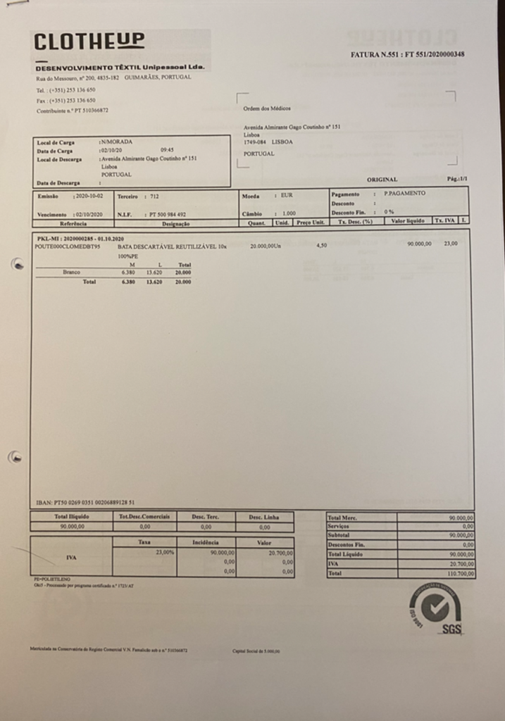 Vejamos um exemplo. A factura nº 551 passada pela Clotheup em 2 de Outubro de 2020 pela aquisição de batas descartáveis no valor de 110.700 euros foi emitida à Ordem dos Médicos. Tendo sido uma aquisição a pronto de pagamento, não houve saída de dinheiro da Ordem dos Médicos, porque quem a pagou foi a conta solidária de Miguel Guimarães e dos outros dois co-titulares. Ora, nesse dia, poderia ter sido “desviada” a verba de 110.700 euros da conta bancária oficial da Ordem dos Médicos, não havendo assim o mínimo sinal de qualquer desfalque, uma vez que existia uma factura a suportar essa saída. Esse expediente pode aplicar-se a qualquer outra das 31 aquisições identificadas pelo PÁGINA UM.