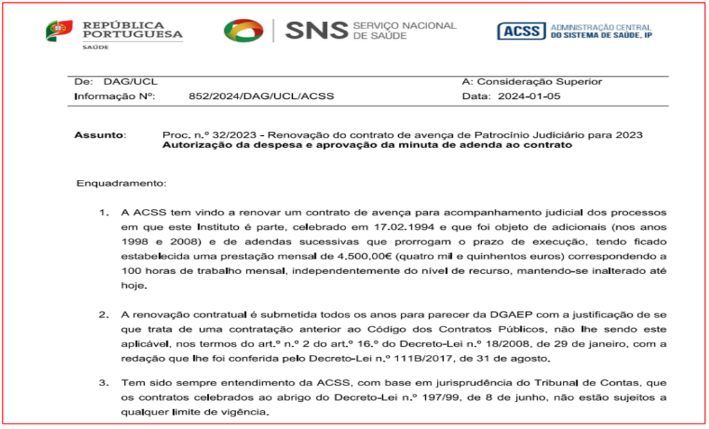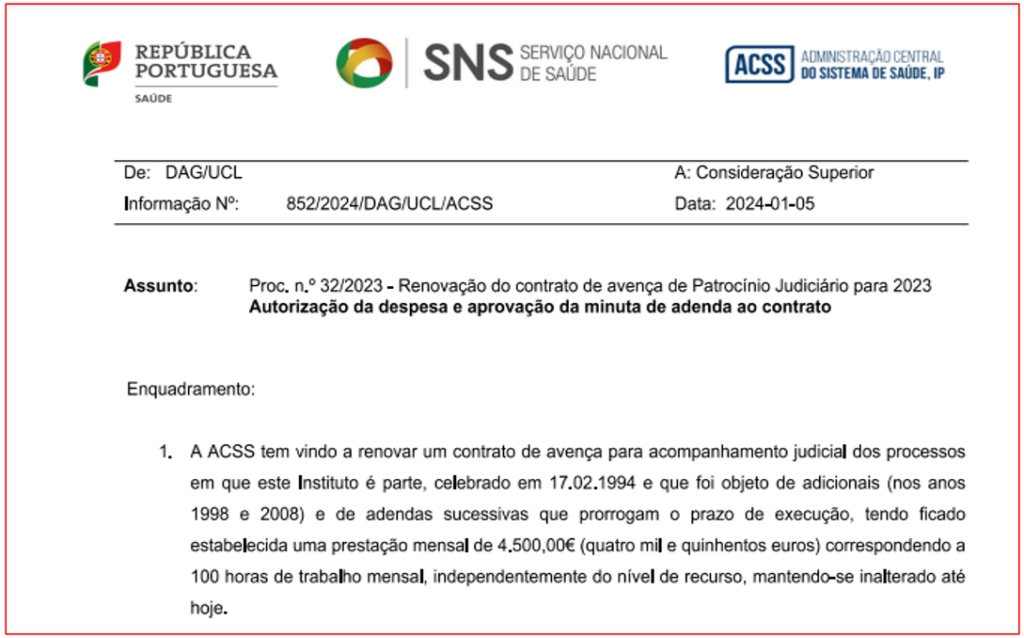 Esta situação consta de uma informação de Janeiro passado escrita por uma técnica superior da ACSS, consultado pelo PÁGINA UM, com vista à autorização da despesa e aprovação da minuta de adenda da renovação deste patrocínio judiciário – e que tem permitido, por exemplo, à ACSS manter em ‘despique’ jurídico o legítimo acesso à base de dados dos internamentos hospitalares, mesmo depois de o PÁGINA UM ter conseguido vitórias sucessivas, incluindo um acórdão do Supremo Tribunal Administrativo.