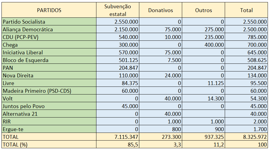 Embora seja muito previsível que estes valores sejam substancialmente rectificados após as eleições, sobretudo por uma das receitas (subvenções do Estado) dependerem dos resultados dos votos recoilhdos, os partidos que entregaram o seu orçamento apontam para um gasto total de um pouco mais de 8,3 milhões de euros. Deste montante, 85,5% virá das subvenções estatais – que em alguns partidos poderá ficar aquém do que estimam – e 11,2% de outras proveniências, em especial de fundos próprios.