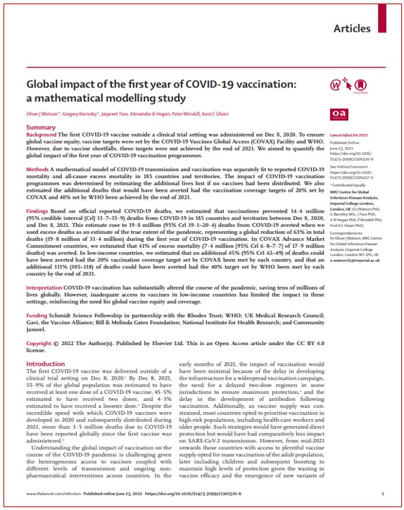 Ora, nos últimos dois dias muito se tem falado de um estudo, publicado na revista científica The Lancet Infectious Diseases por investigadores do Imperial College de Londres sobre a eficácia das vacinas contra a covid-19, atribuindo-lhe a “responsabilidade” de terem salvado cerca de 20 milhões de vidas em todo o Mundo. Em Portugal, segundo as declarações de um dos autores dessa análise (Oliver Watson) ao jornal Público, estimaram que se tenham evitado 135.900 mortes até 8 de Dezembro de 2021, com “uma incerteza entre 126.700 e 179.300 mortes”.